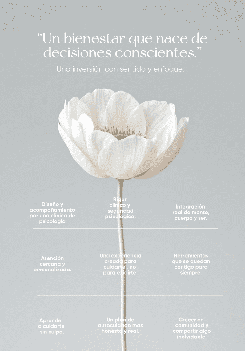 Este retiro es un espacio seguro, íntimo y profesional, donde no tienes que rendir, ni exponerte más de lo que necesitas, ni convertir el autocuidado en otra exigencia.